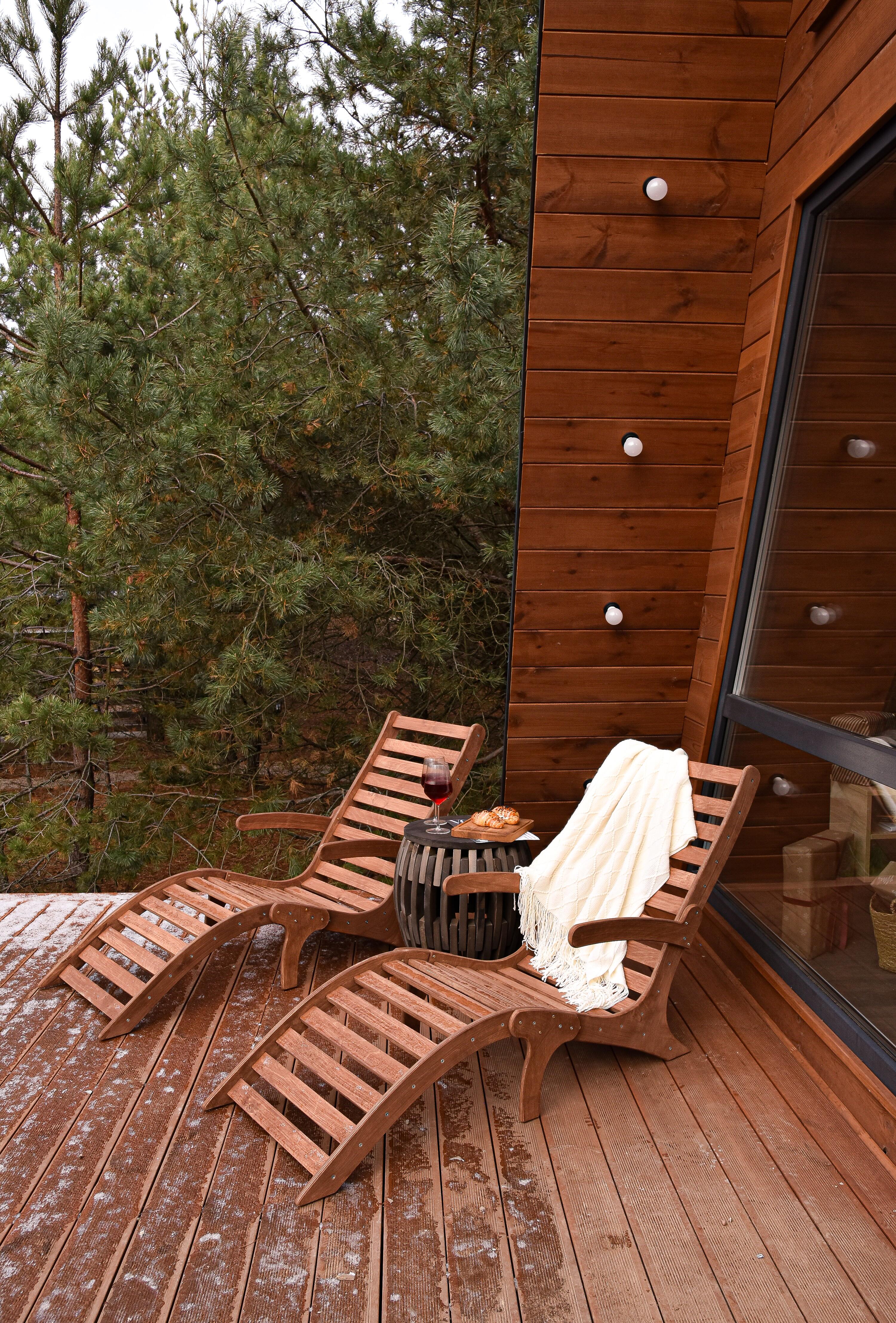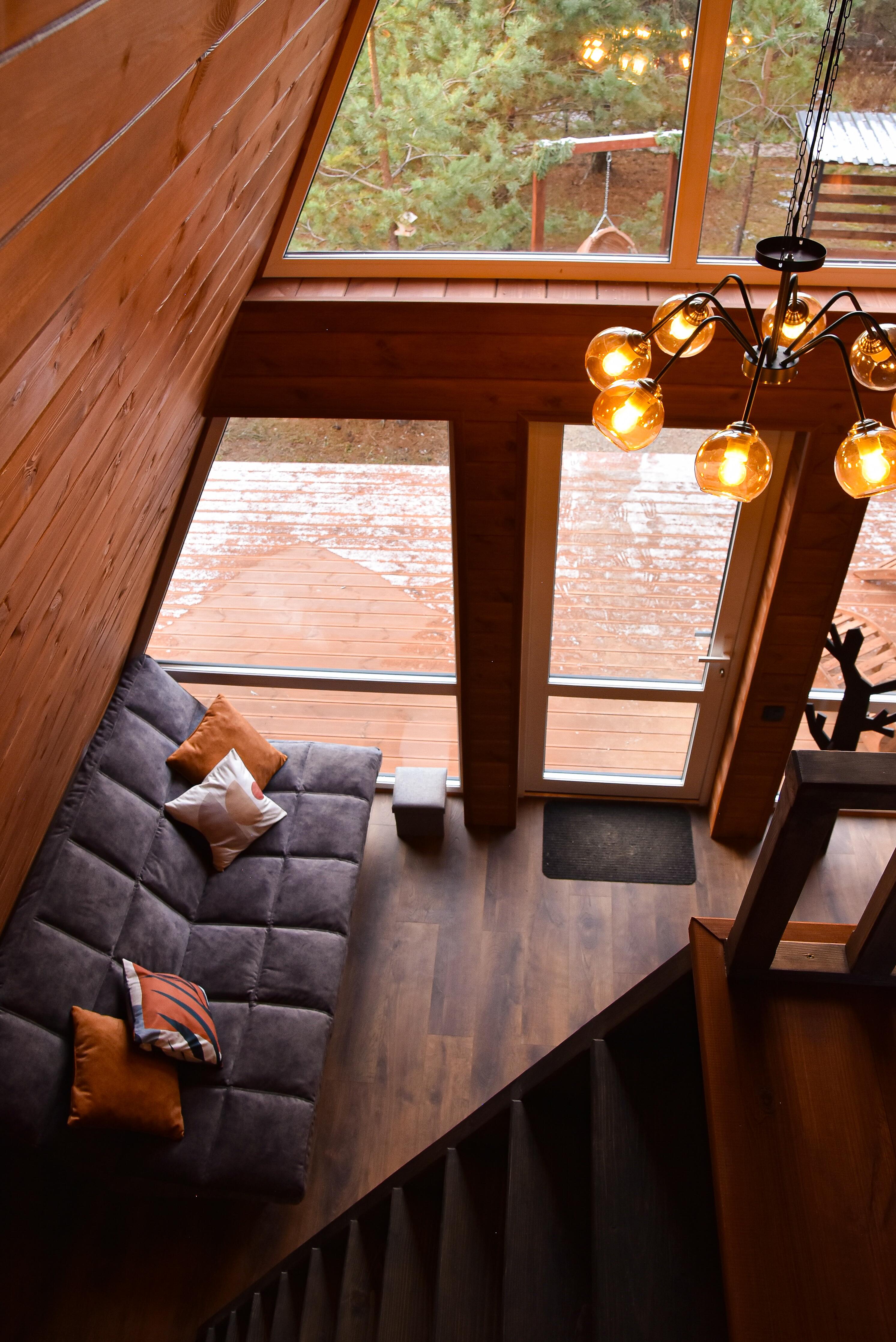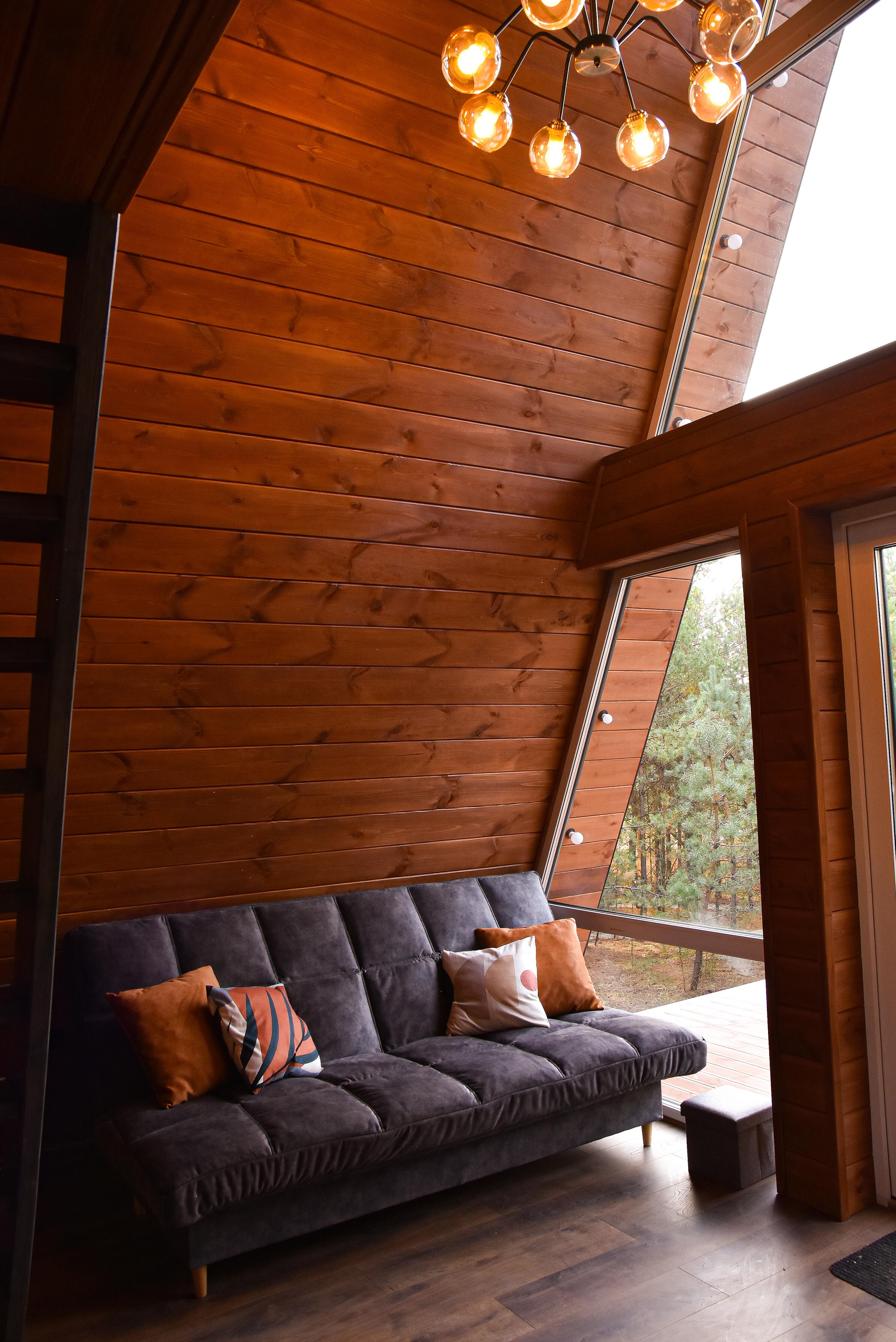 Наш треугольный дом, выполнен в теплых древесных оттенках, который гармонично вписывается в окружающий пейзаж. Его очертания создают уютную атмосферу, а панорамные окна на всех уровнях заполняют пространство естественным светом и открывают великолепный вид на лес.