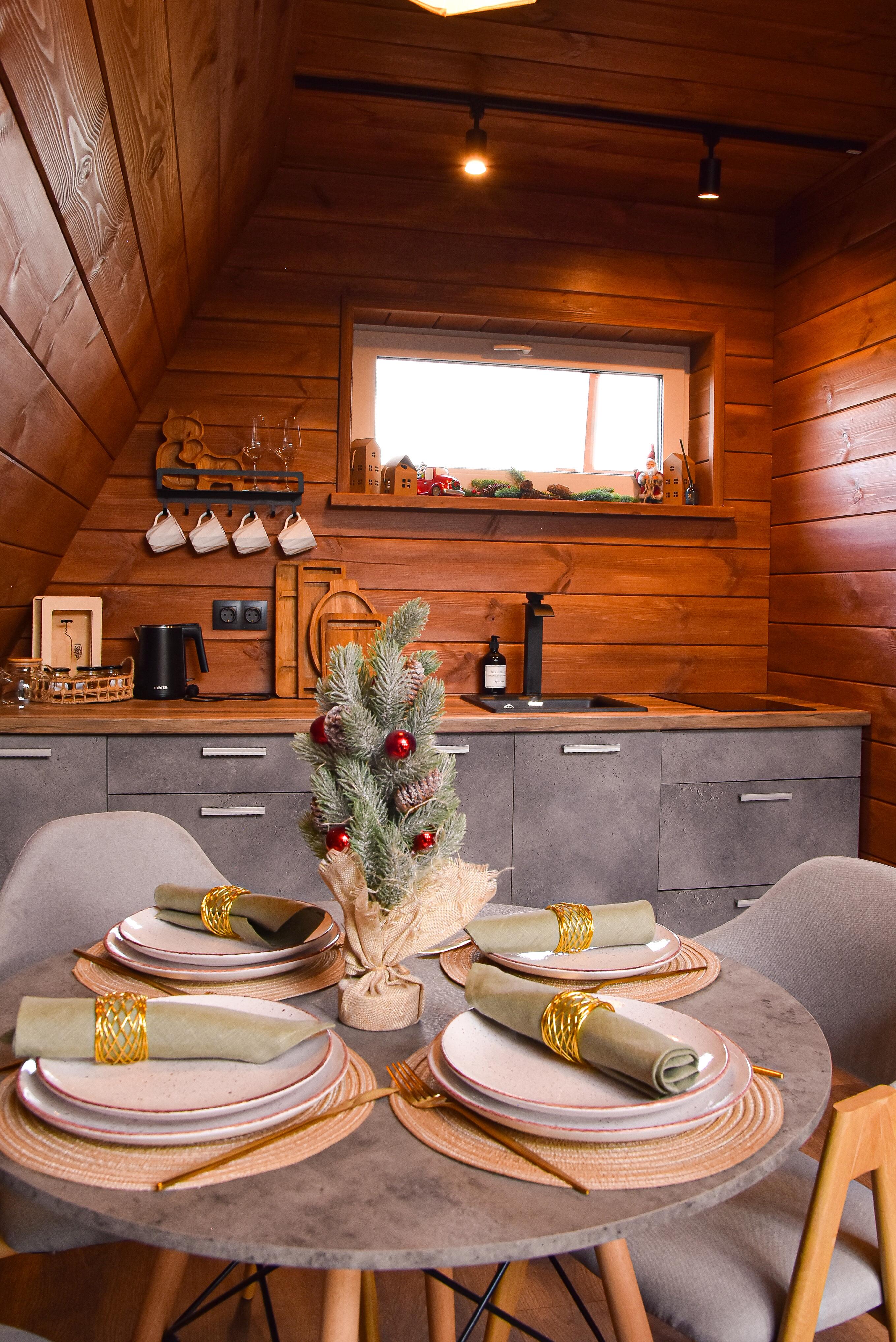 На первом этаже расположена современная кухня со всем необходимым для вашего комфортного отдыха, где вы сможете готовить любимые блюда, наслаждаясь процессом.