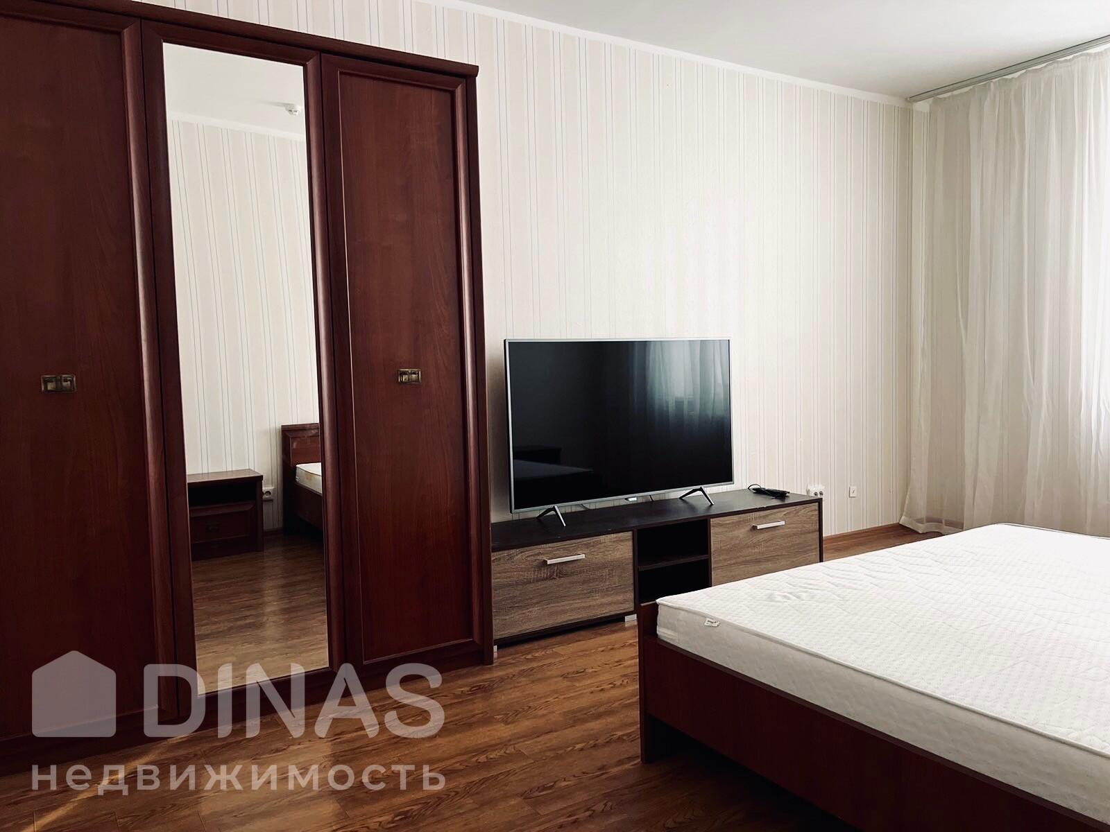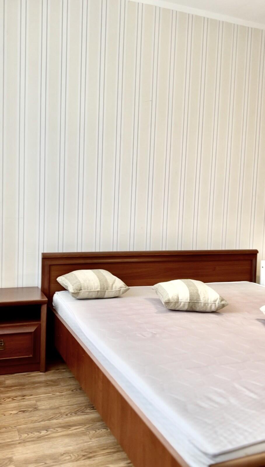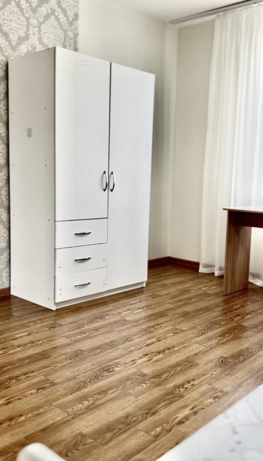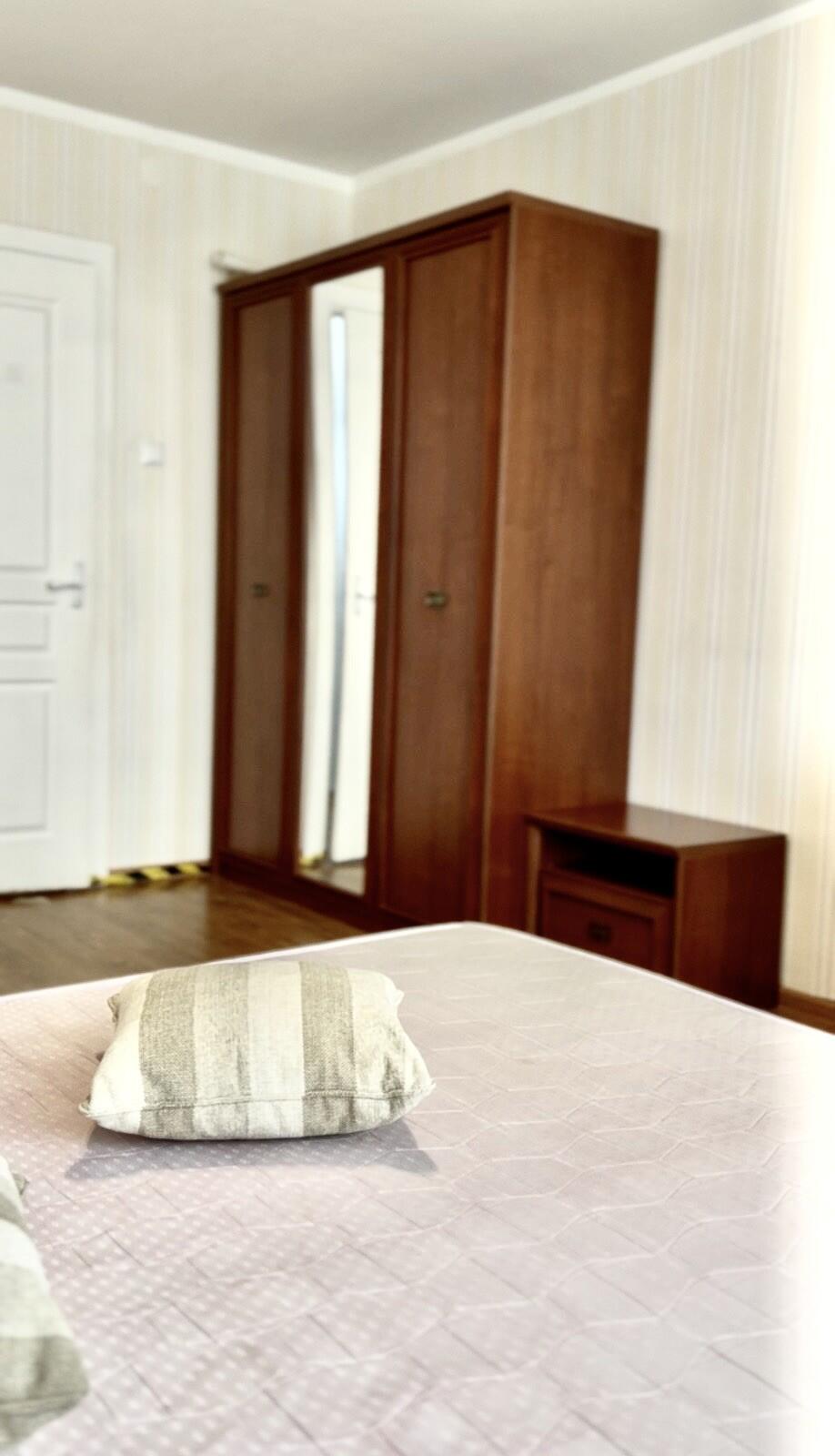 В спальне установлена большая двуспальная кровать, вместительный шкаф и новый телевизор.