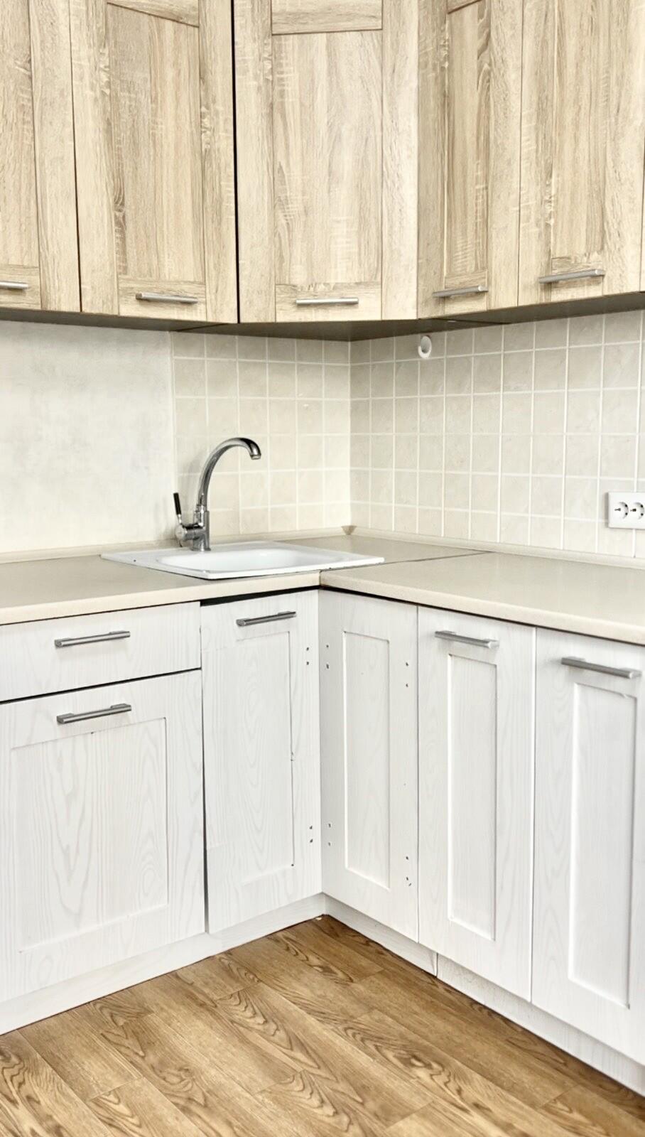 Кухня оснащена всем необходимым: варочная поверхность, духовой шкаф и холодильник.