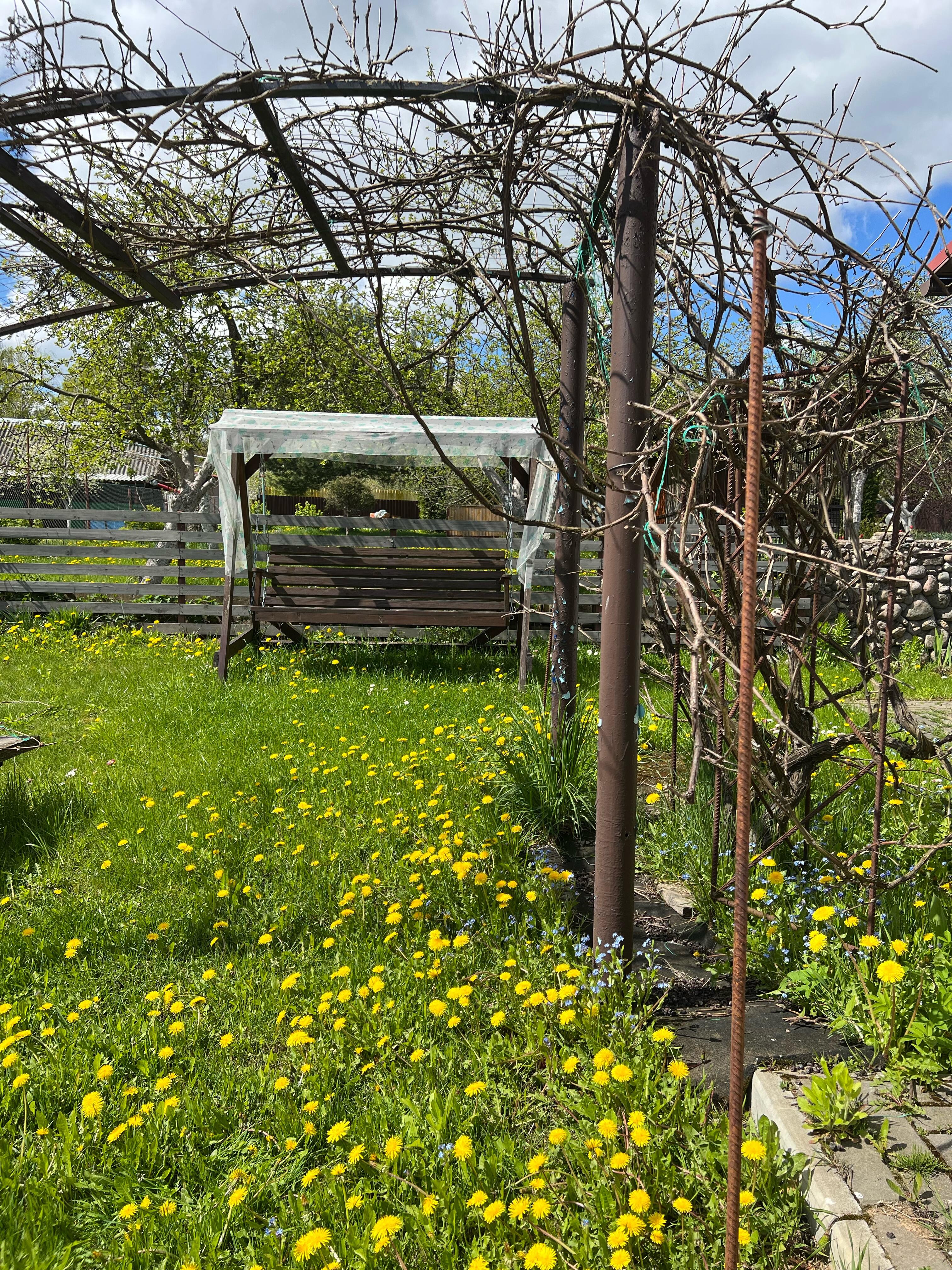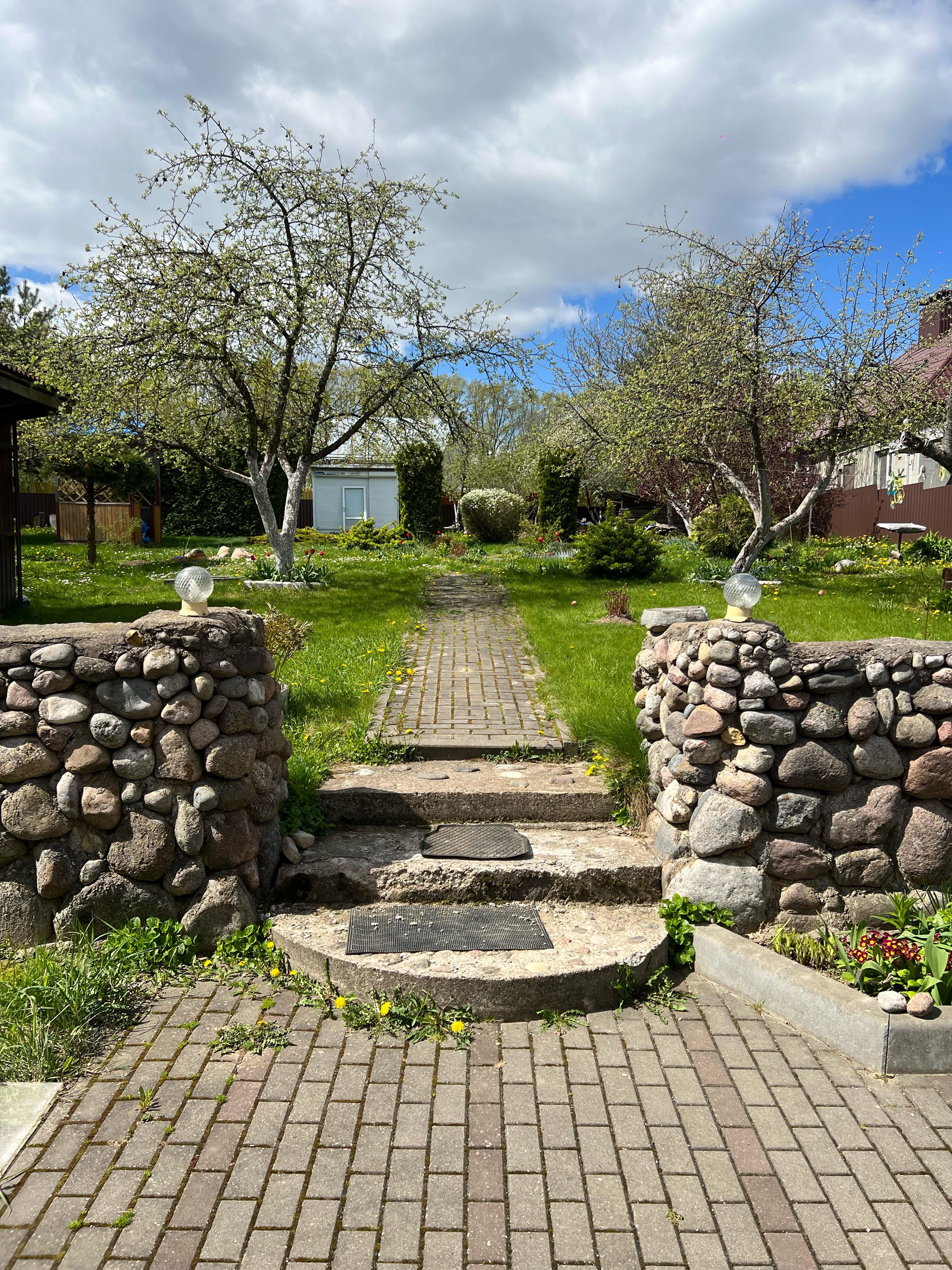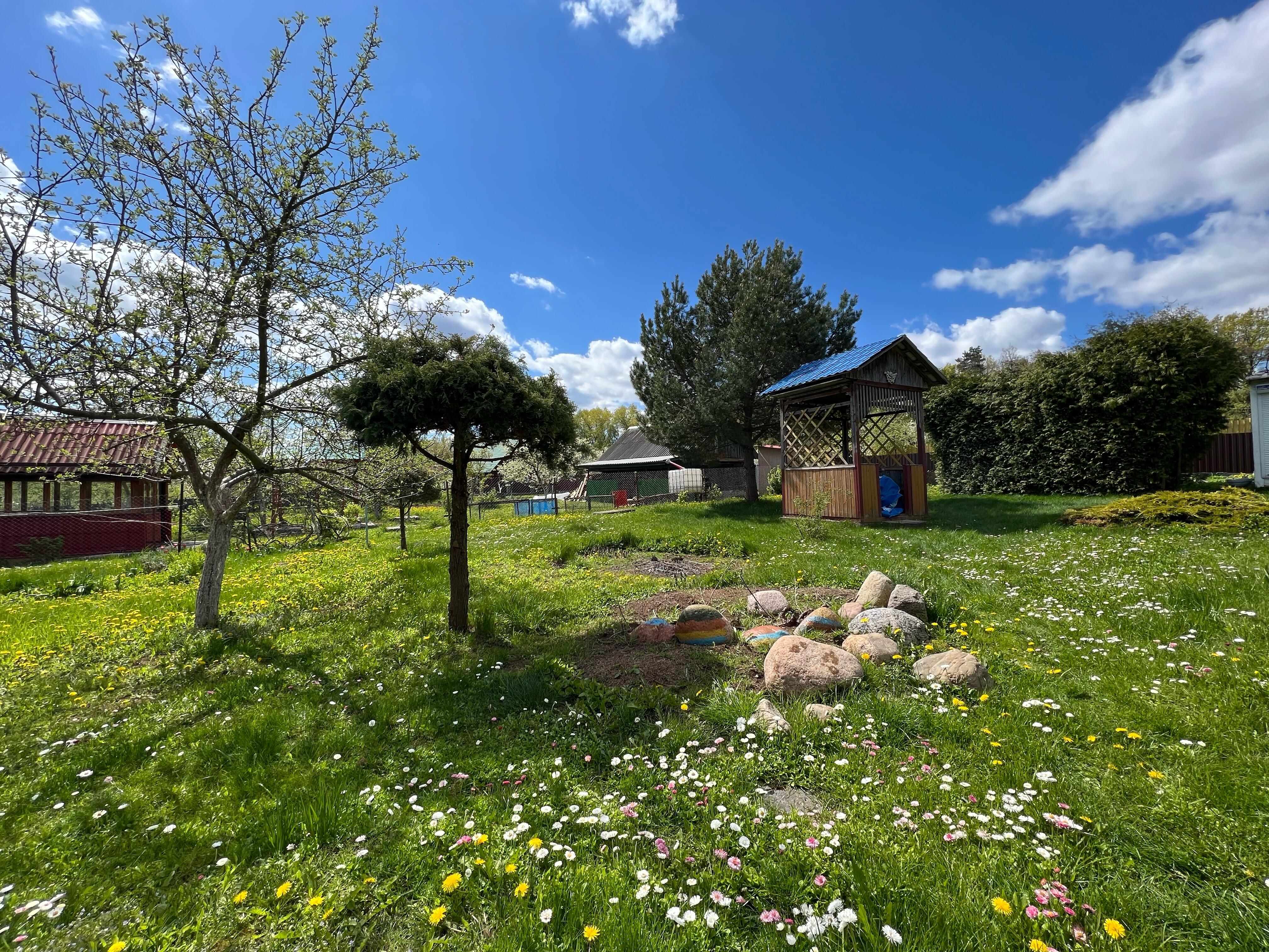 На участке большое разнообразие плодоносных кустарников, деревьев и цветов. Многолетние цветы: Пионы, ирисы, лилии, хосты, розы и др.