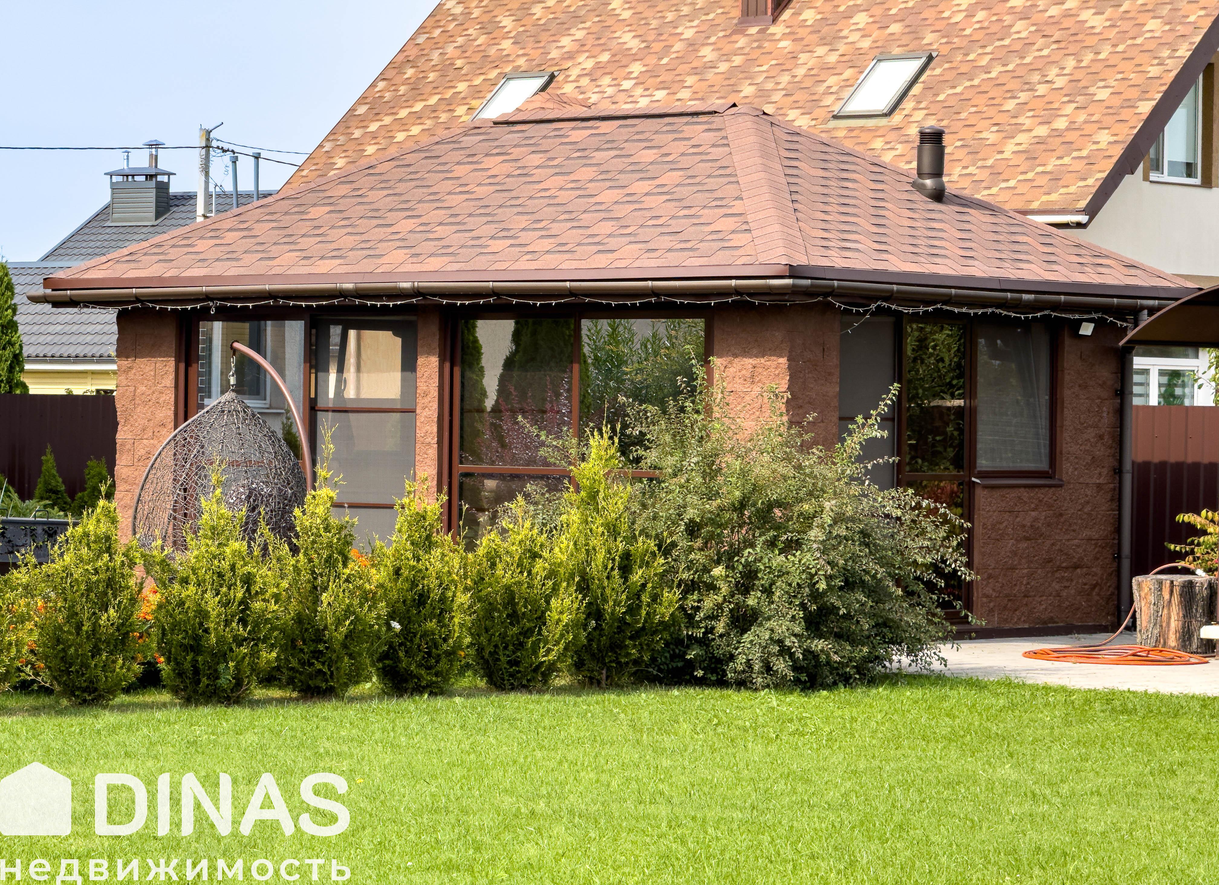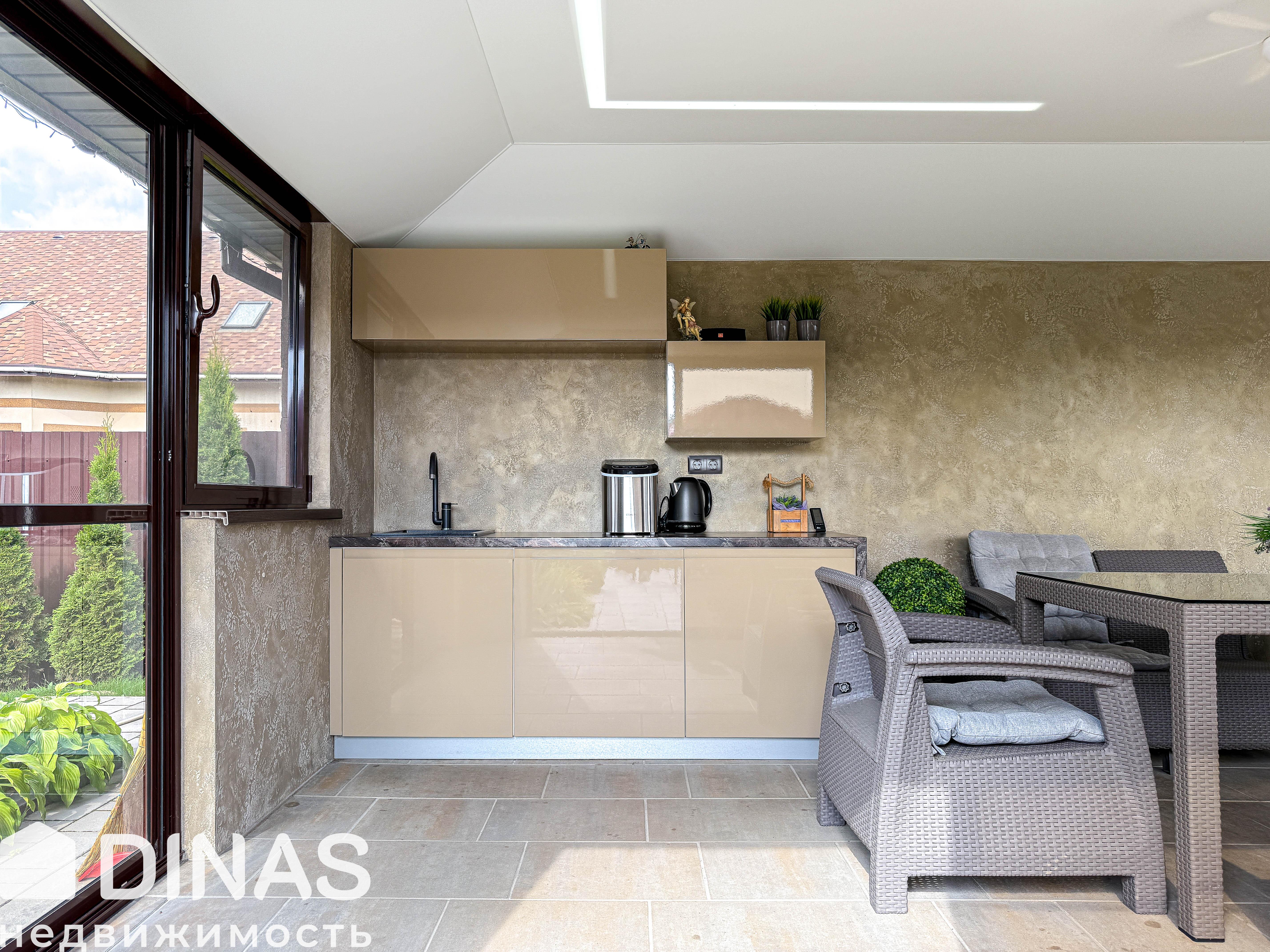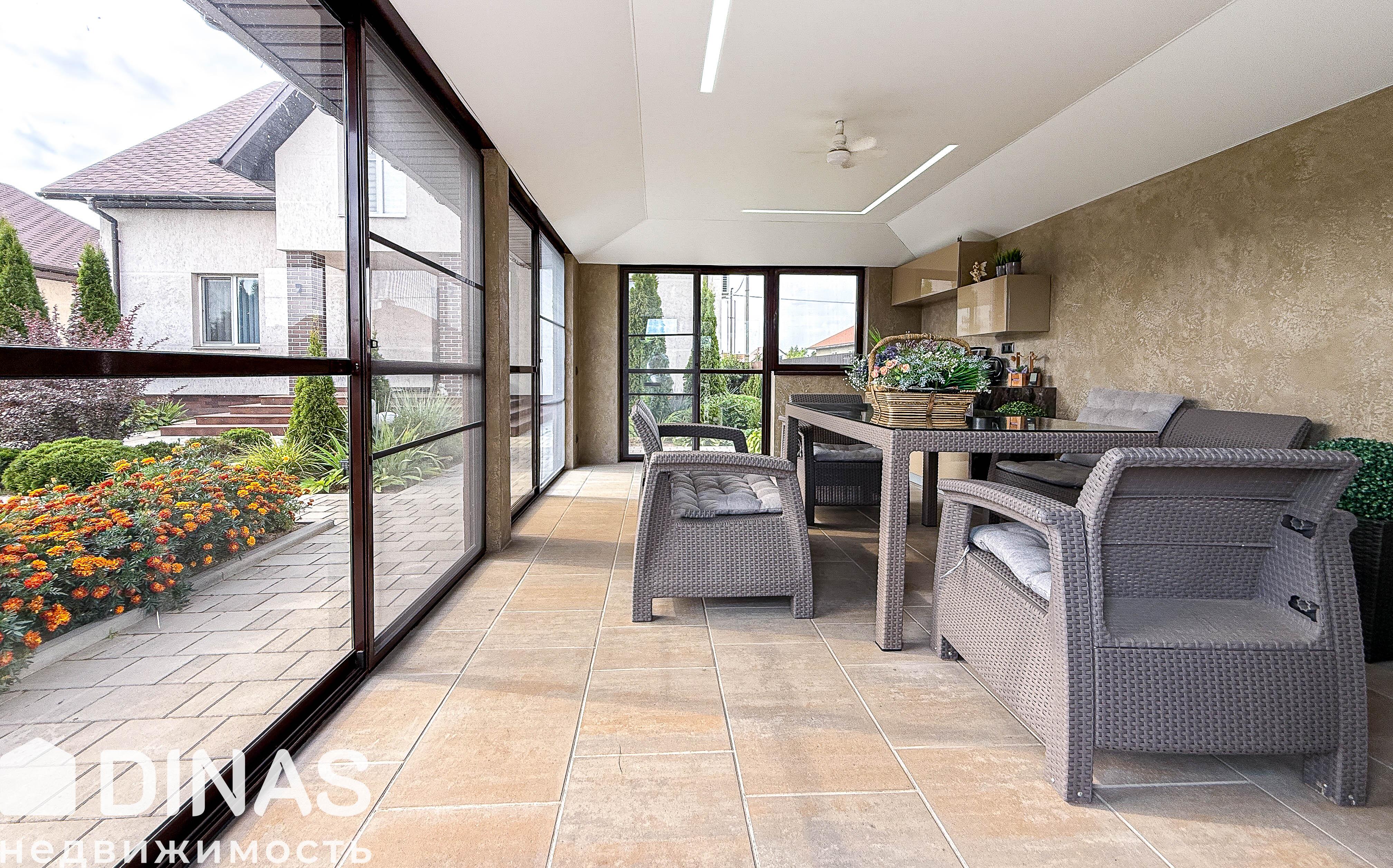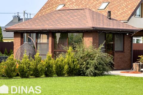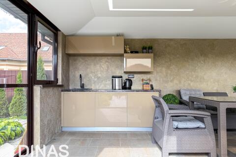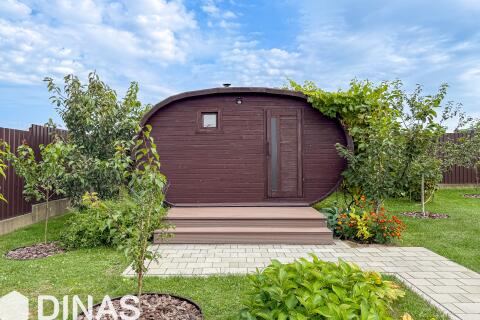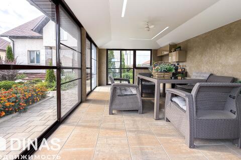 - Современная беседка с панорамным остеклением, полностью оборудованная для комфортного отдыха и приёма гостей. Внутреннее пространство включает большой обеденный стол, удобные кресла и диваны. Для удобства предусмотрены холодильник и небольшая кухня.